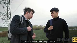 Horny Mrs principal joins mmf threesome car stockings shaved pussy natural tits