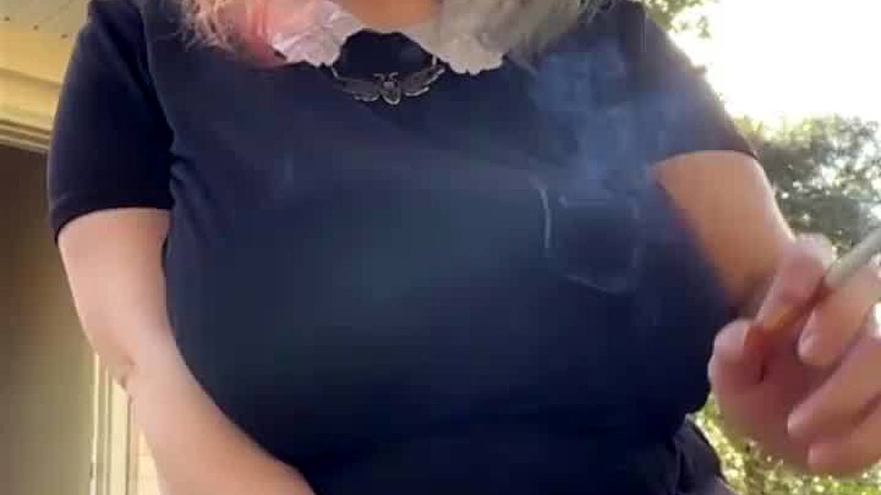 Huge Titted Milf Smokes Naked with Trimmed Landing Strip Pussy. Watch Her Voyeur Style!