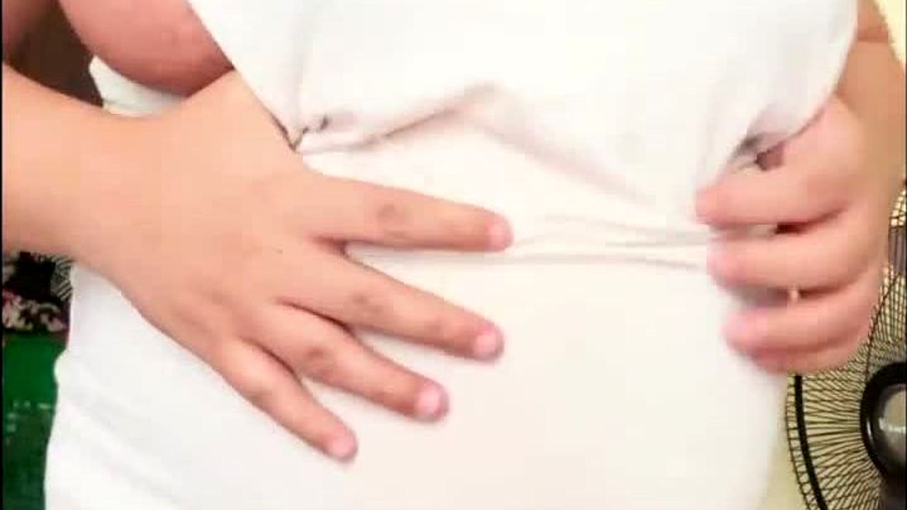Chubby MILF wife teases with her pregnant belly and lactating boobs