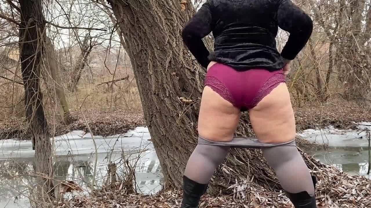 mother-in-law pees doggystyle in light summer dress at public outdoor spot