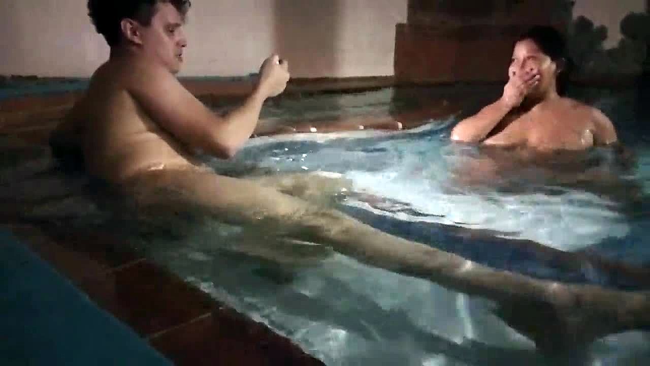 A wife enjoys a swim in the hotel pool, wearing a hot one-piece swimsuit