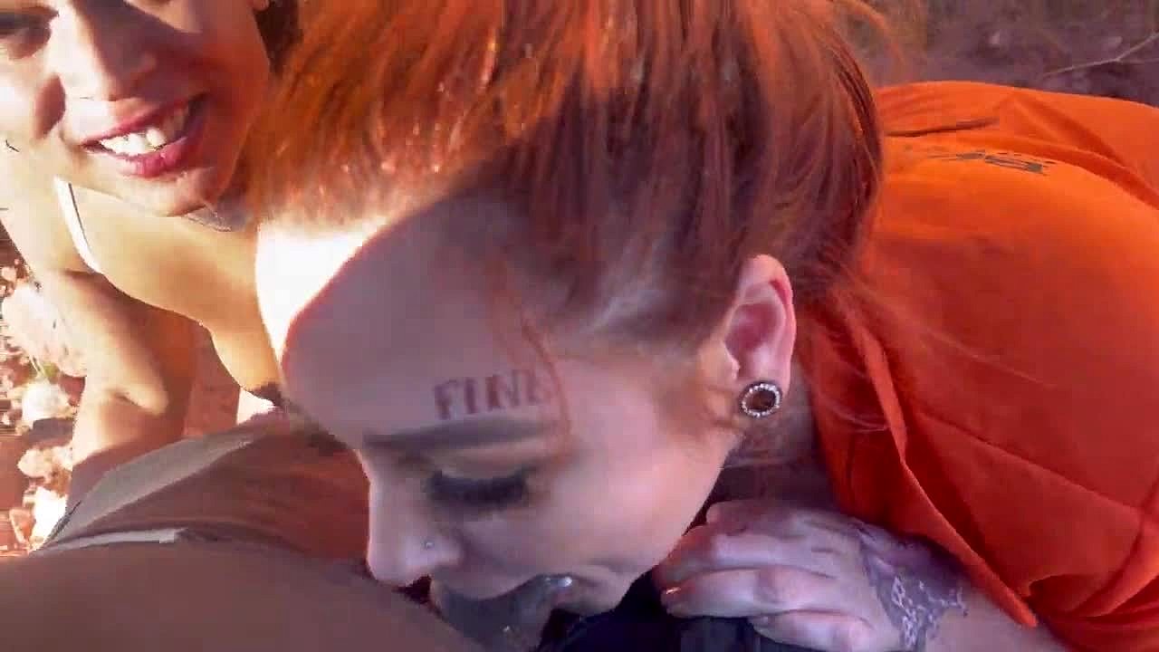 Milf suspect caught in garage lets guard get naughty with blowjob and deepthroat.