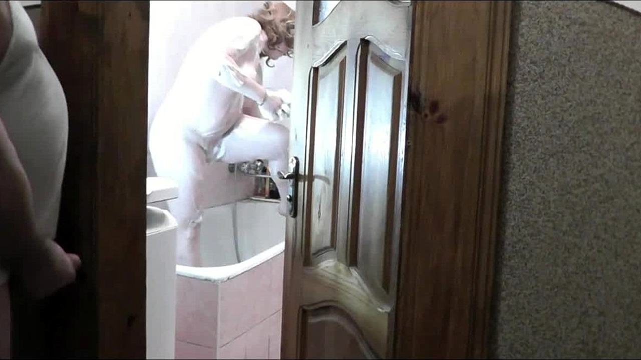 Naked wife covered in neighbor's cum! Husband jerks off, they do threesome double penetration.